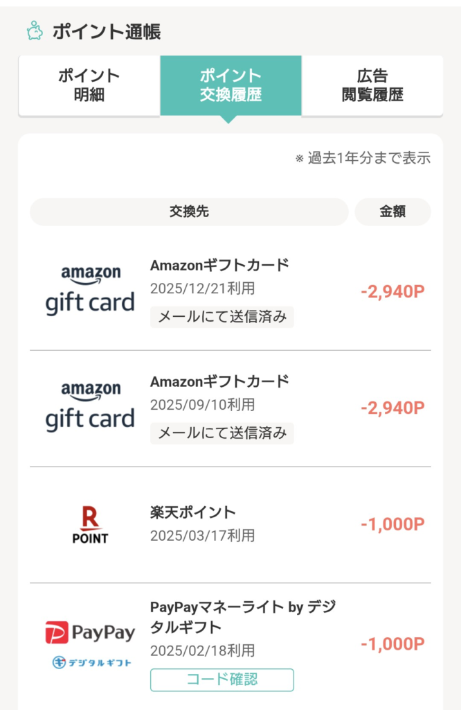 これまでも楽天市場で買い物をするとき、忘れなければ「モッピー」を経由するようにしていました。改めて交換履歴を確認すると、累計で5,000円分以上のポイントを交換していました。