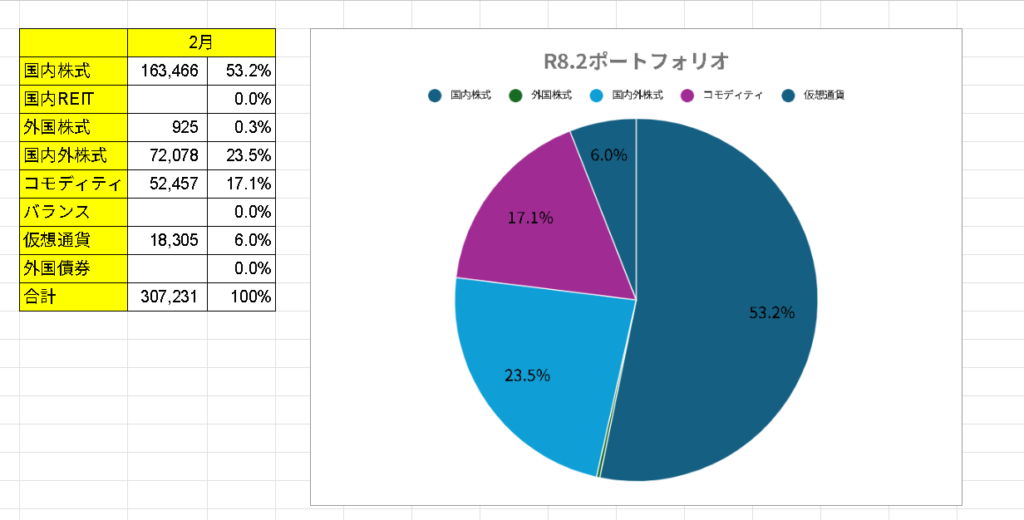 2月末時点のポートフォリオは国内株式53.2%、国内外株式23.5%、コモディティ17.1%、仮想通貨6.0%という構成になった。端株の積み上げによって国内株式の比率が着実に高まっている。